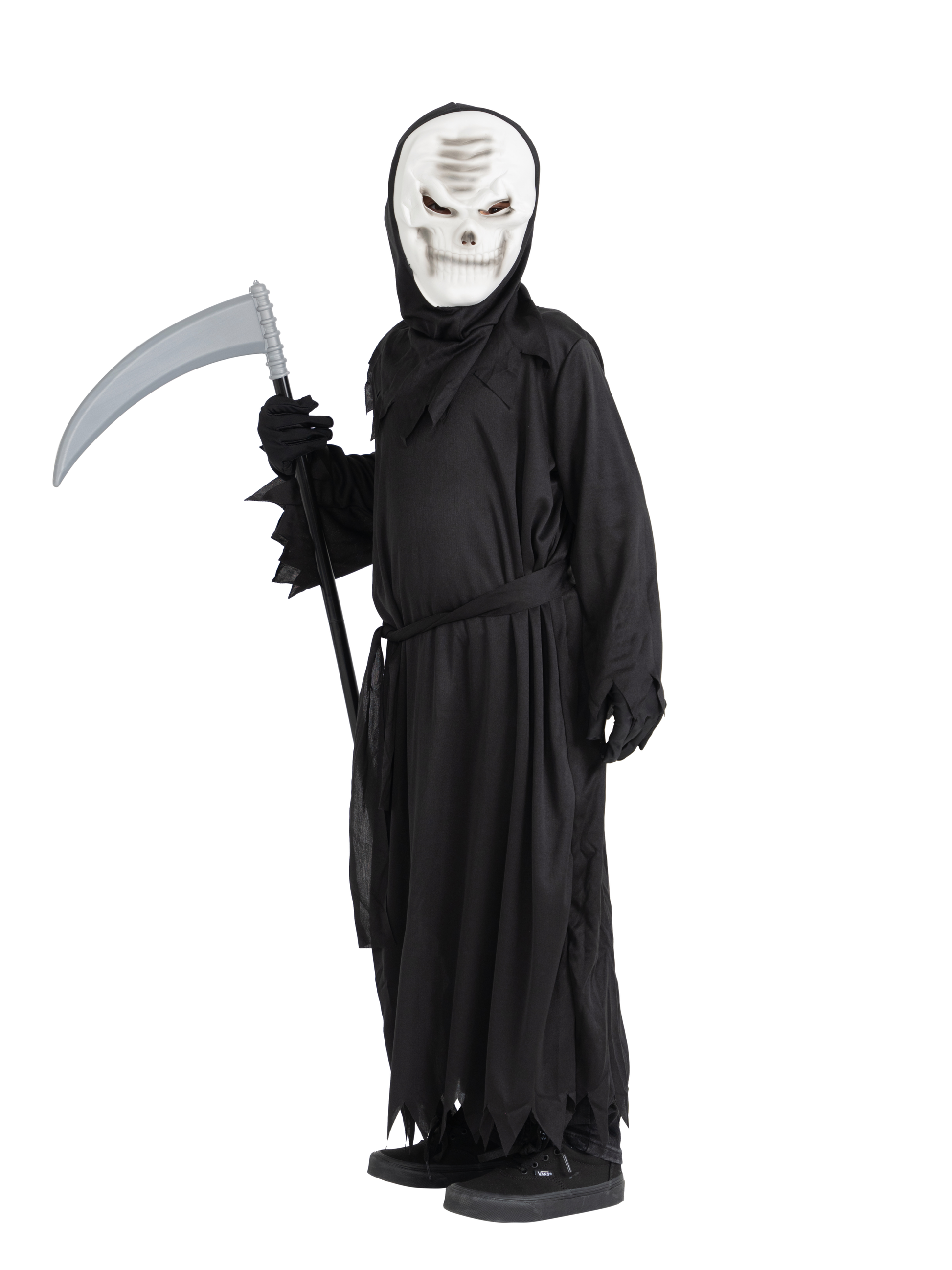 • CLOAKED IN BLACK - The grim reaper set includes a cloak, hooded face mask, scythe, gloves, and belt. The costume is designed to look the part with its realistic details and features. Bring up a notch this year with this perfect scary costume!