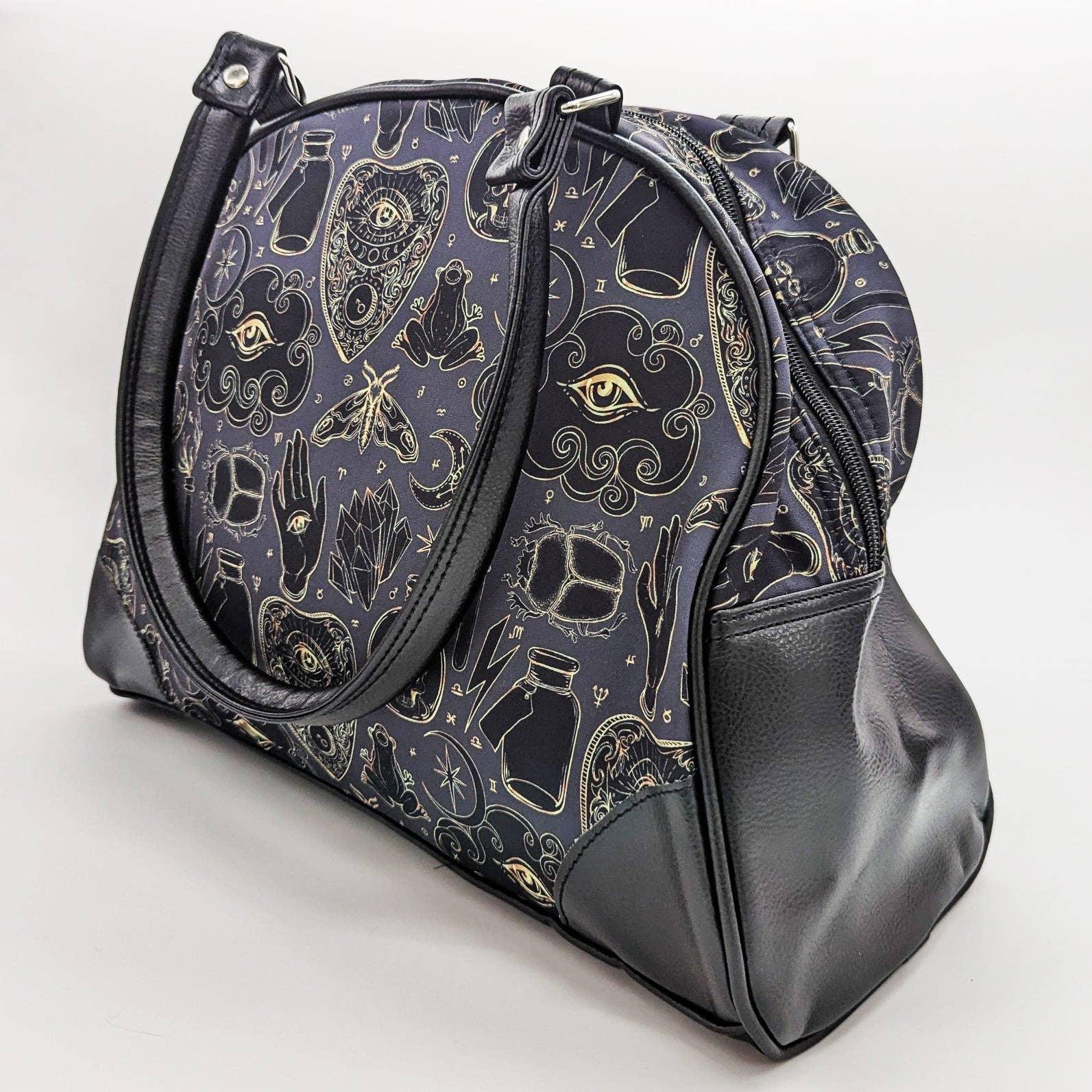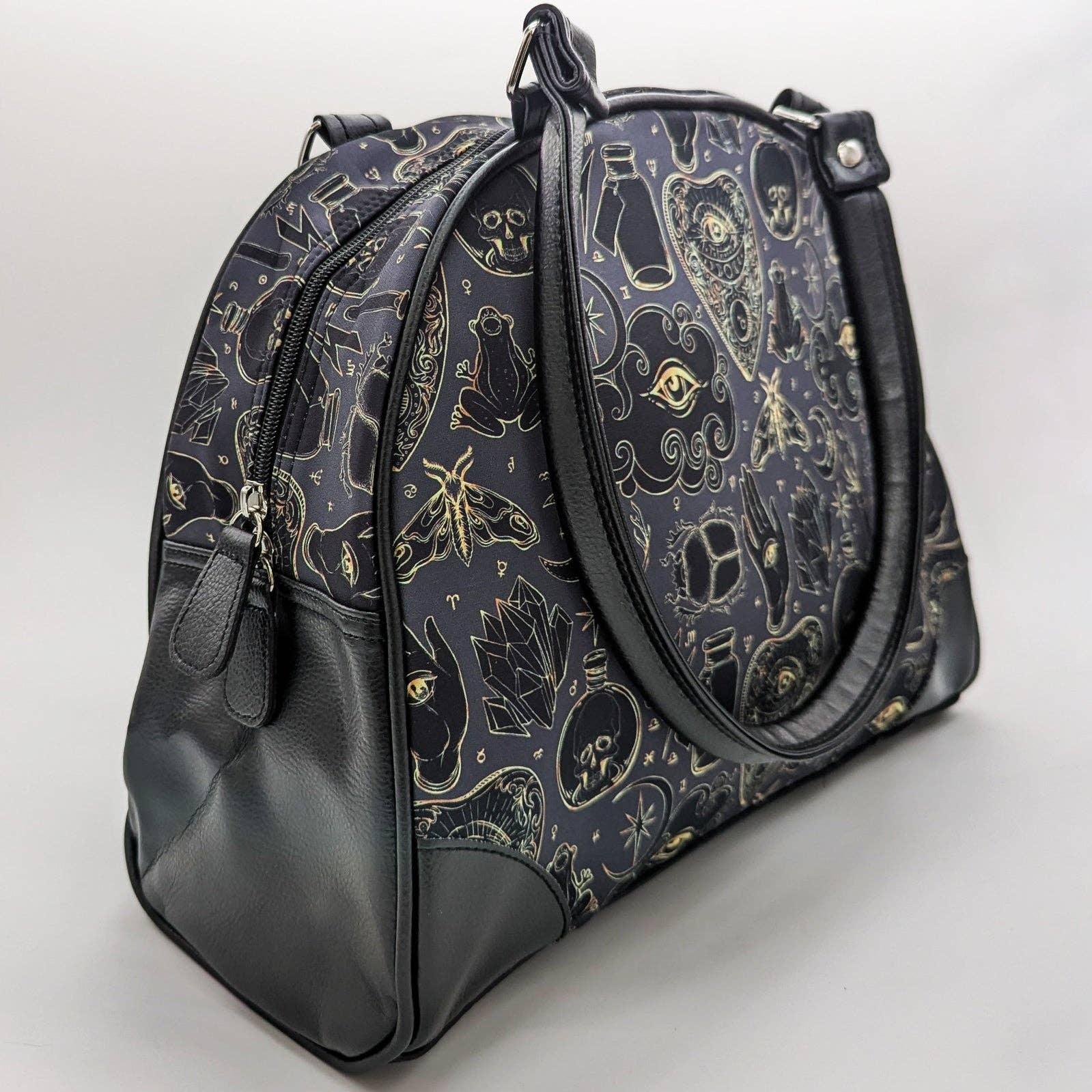 This classic Bowler has satin like sides, foam padding and premium zippers. It also features high quality faux leather on the bottom and middle, with metal feet to keep it protected, as well as an interior zippered pocket for valuables. Dimensions are approximately 14 inches wide and 10 tall.